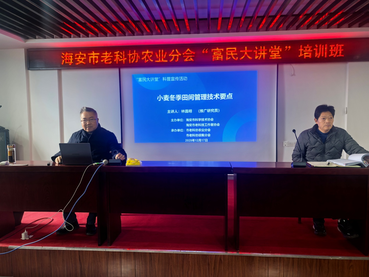 12月17日,海安市老科协农业分会协同高新区区域农业服务中心,利用“富民大讲堂”平台,在胡集街道宝佳家庭农场会议室,对高新区30多个种粮大户进行“小麦冬季田间管理技术要点”培训。农业分会理事、粮食种植专家组组长、南通市首批科技传播专家林昌明推广研究员担任主讲。